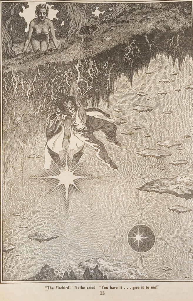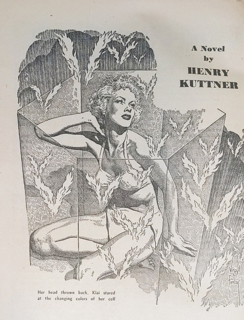 It’s now apparent to me that the artwork on the cover of the mag issue was supposed to represent this novel, which is hardly surprising but it’s nice to have it confirmed. That said, the ladies in this book (there were three! I think this book passes the Bechdel test) did not wear such scant clothing as is represented here on the cover, or in the interior artwork by Virgil Finlay. I think at least two of the women (the evil ones) were covered from head to toe, in fact.